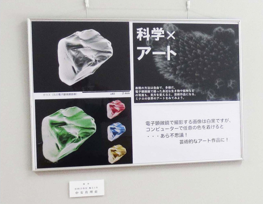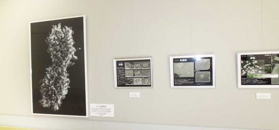 8月4日より8月28日まで鳥取大学医学部附属病院の外来ギャラリーで「電子顕微鏡で観るミクロの世界の写真展」が開催されました。鳥取大学医学部解剖学講座 稲賀先生の指導のもと、鳥取大学医学部電子顕微鏡サークルの学生・院生などが観察・撮影した作品を展示。