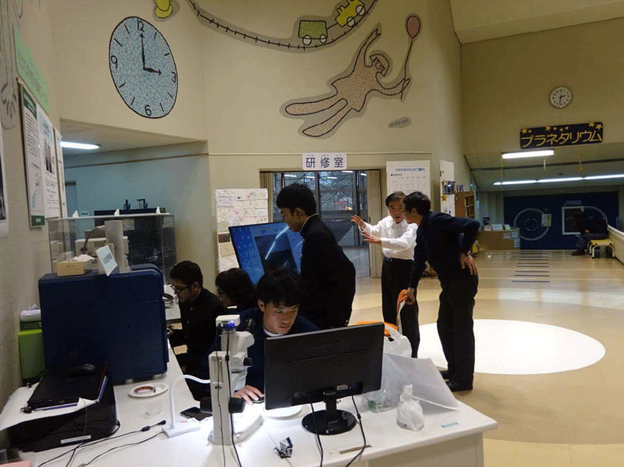 米子東高校2年生3名が電子顕微鏡観察に。撥水の仕組みを調べたいということで、ハスの葉を持ってくる予定が、 ハスの葉がなく、別のクローバの葉を観察すると大発見が!?