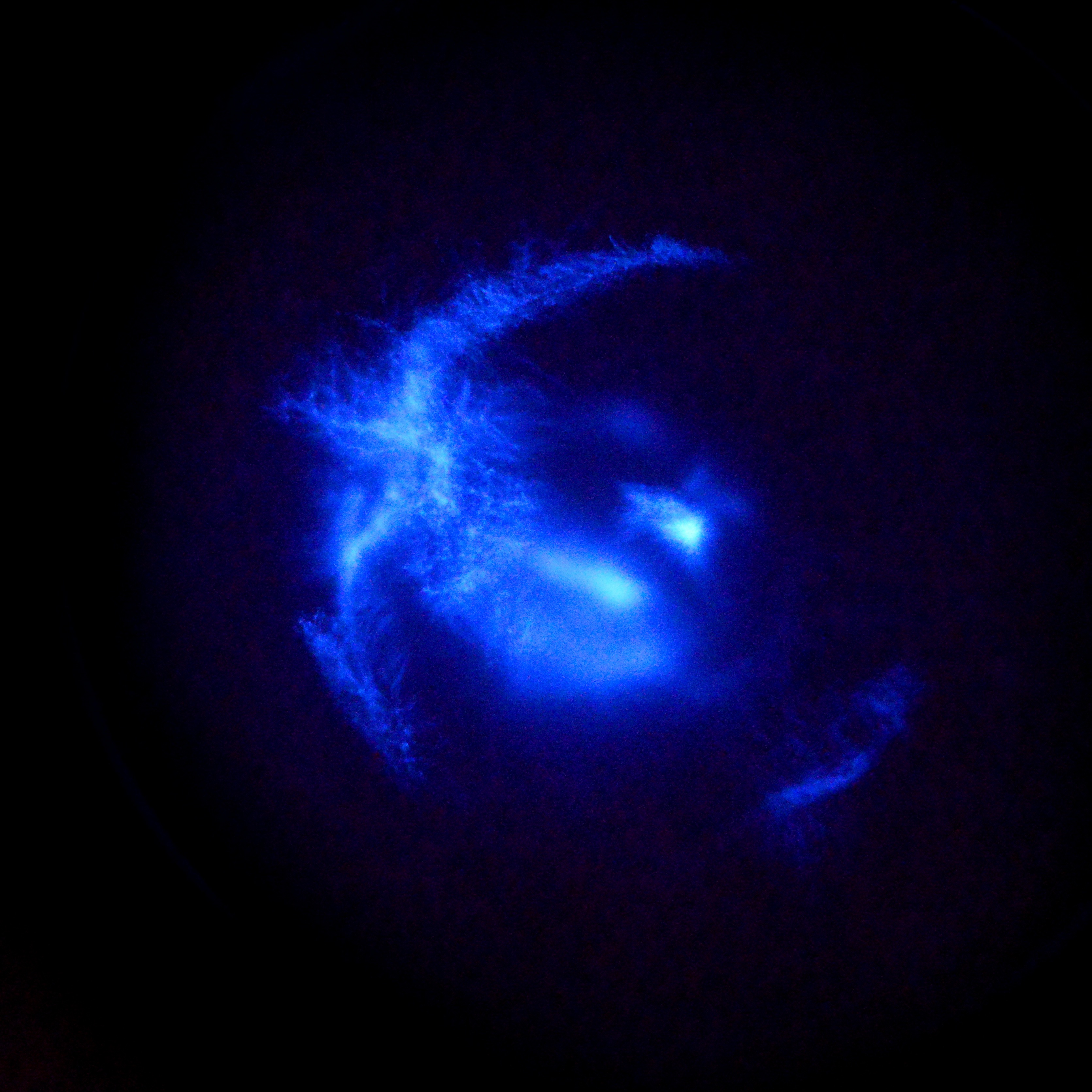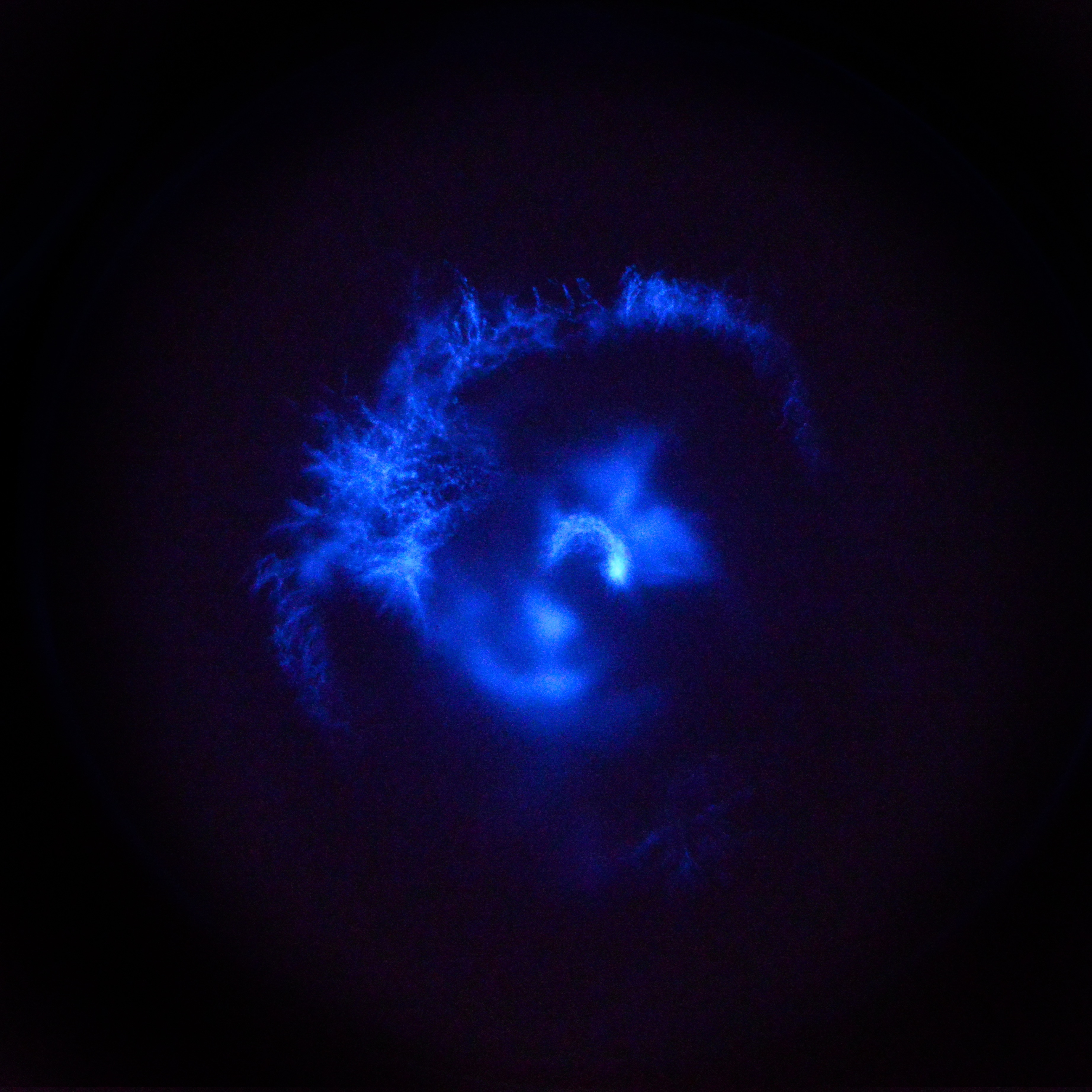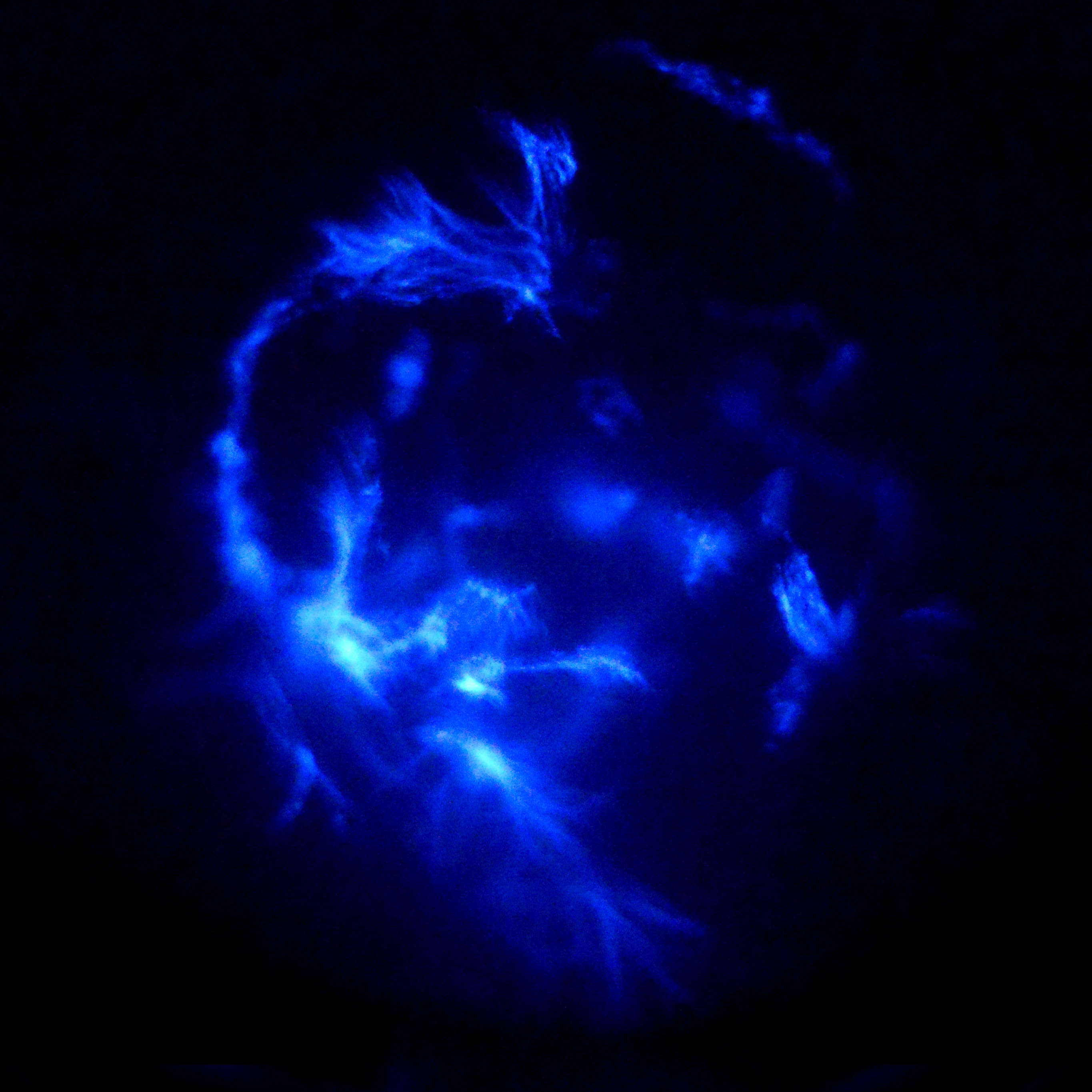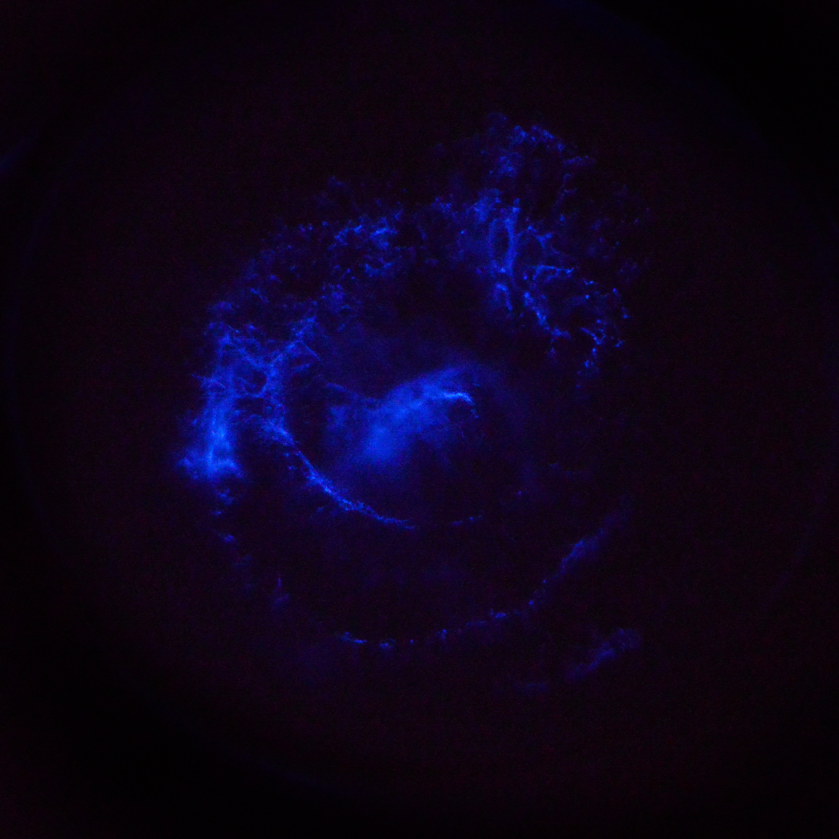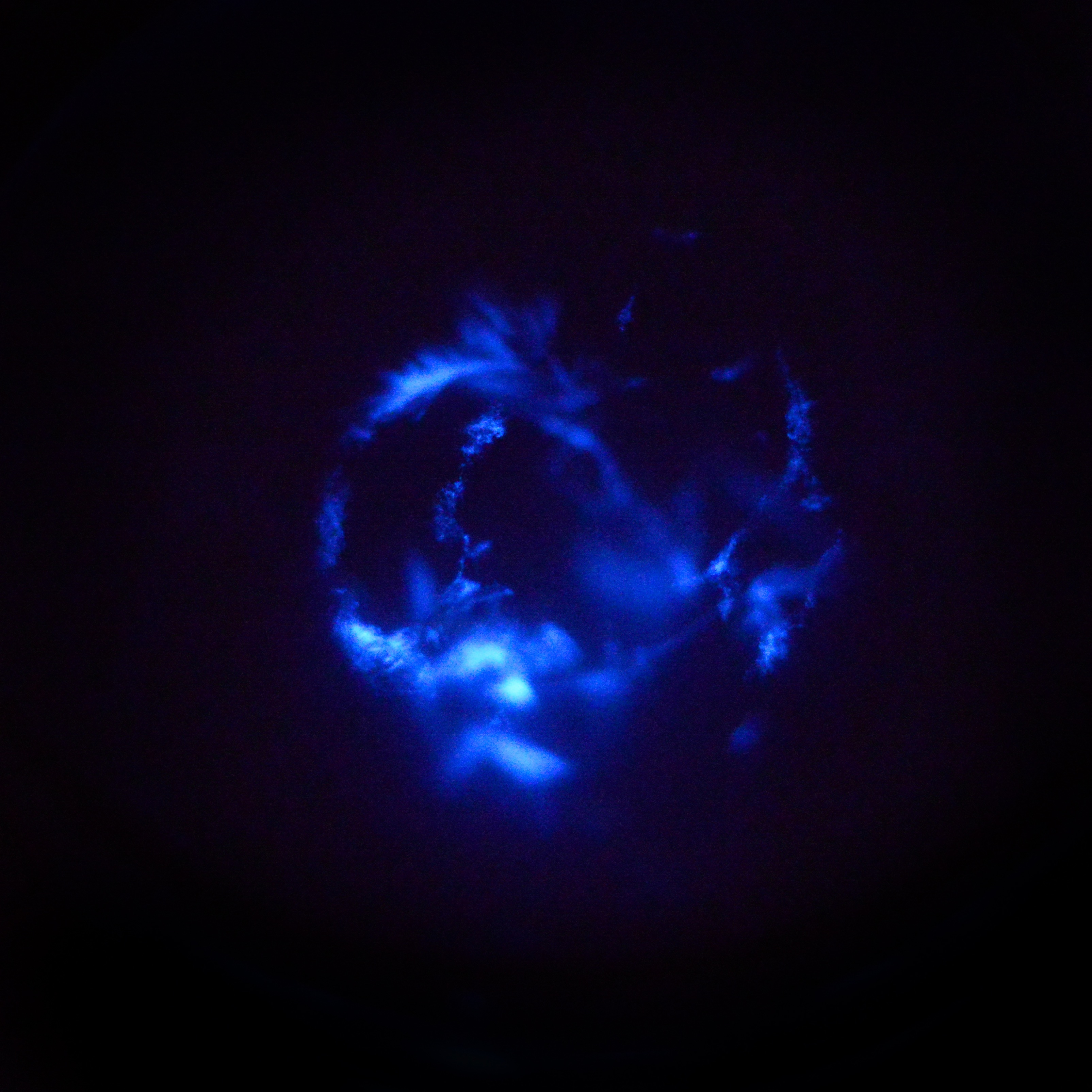 本作では、走査電子顕微鏡(SEM: Scanning Electron Microscope)を用い、身近に存在する生物・鉱物・人工物を、100万分の1メートルスケールで観察・解析した。ミクロの世界は、私たちの知覚の外に広がる、存在のもうひとつの層である。目に見えず、手に触れられないこの世界は、それでも確かに、私たちの現実をかたちづくっている。 SEMによって得られた像の信号は、音へと変換される。さらに、聴覚を超える高周波は水中に照射され、発光現象(ソノケミルミネッセンス)として立ち上がる。閉じ込められていた情報を、音と光へと翻訳することにより、知覚の限界を拡張し、世界への新たな接触点を探る。 音は、微細な構造を振動として耳に運び、光は、不可聴の波を可視化し、感覚の地平に、存在の気配を浮かび上がらせる。