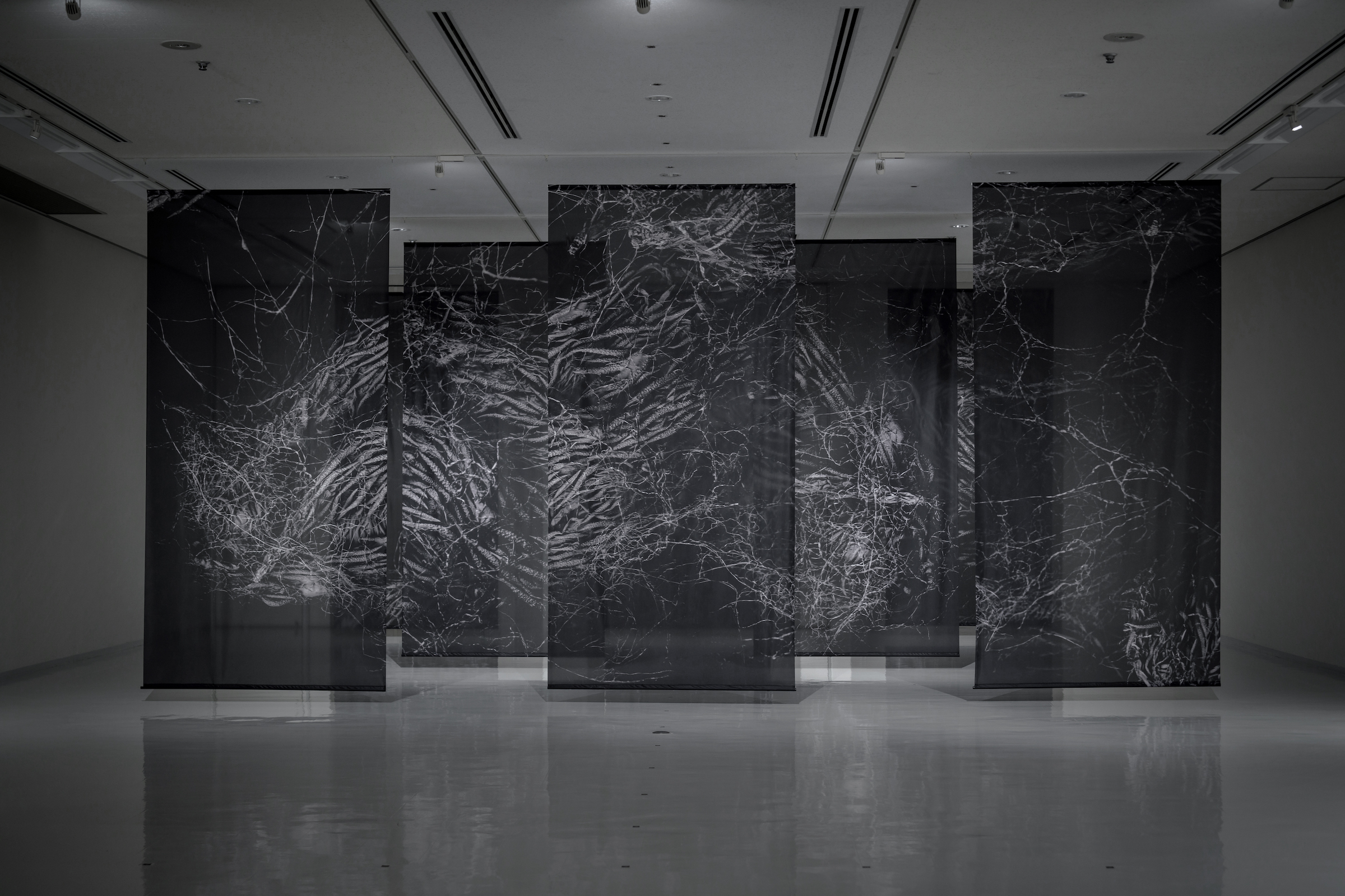 この作品は、数ミリほどの枯れた植物片を走査電子顕微鏡で細分化して撮影し、その断片を繋ぎ合わせて再構成している。